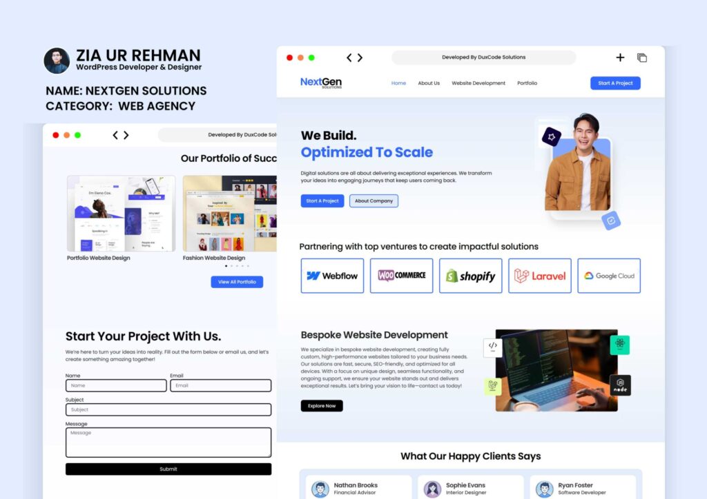 This modern and professional website was designed for NextGen Solutions, a web design agency. It features a clean, responsive layout, engaging UI/UX, a portfolio showcase, and an intuitive contact form. Built with cutting-edge technologies like Webflow, WooCommerce, Shopify, Laravel, and Google Cloud, it ensures a seamless user experience.